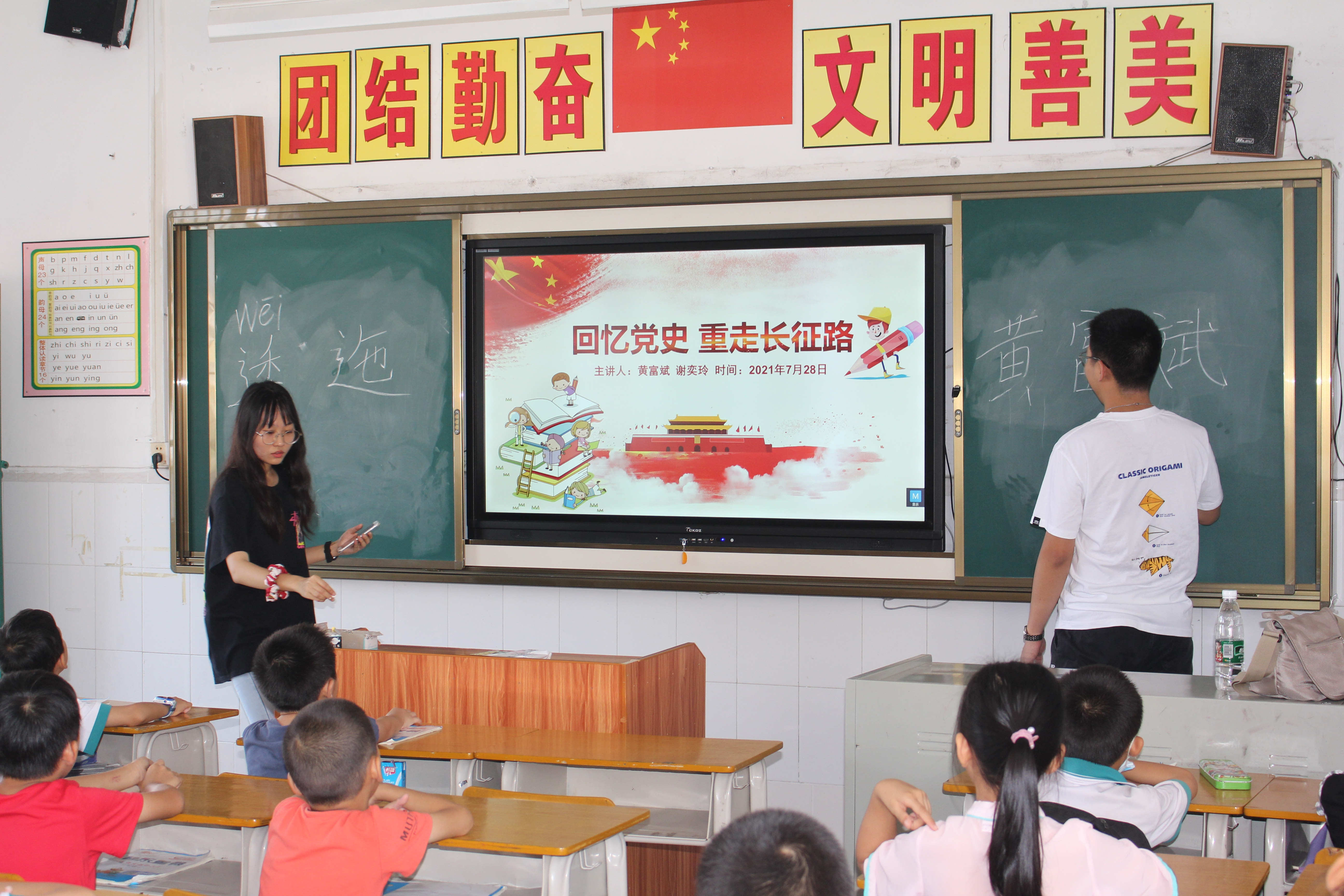 在此次为期7天的“三下乡”支教活动中,实践团队打破了传统的教学模式,采用寓教于乐的方式。今年是建党百年,为了帮助孩子们学习党史,坚定信念,传承红色基因,培养爱国精神与中华优良传统精神,实践团队开展了红色文化系列课程,在学习中重走长征路,了解我们党和国家的历史。同时,队员们结合自身专业,开展了趣味英语课程来帮助孩子们突破说英语的难关,从而激发了孩子们学习英语的兴趣,让英语真正从书本走进学生生活。