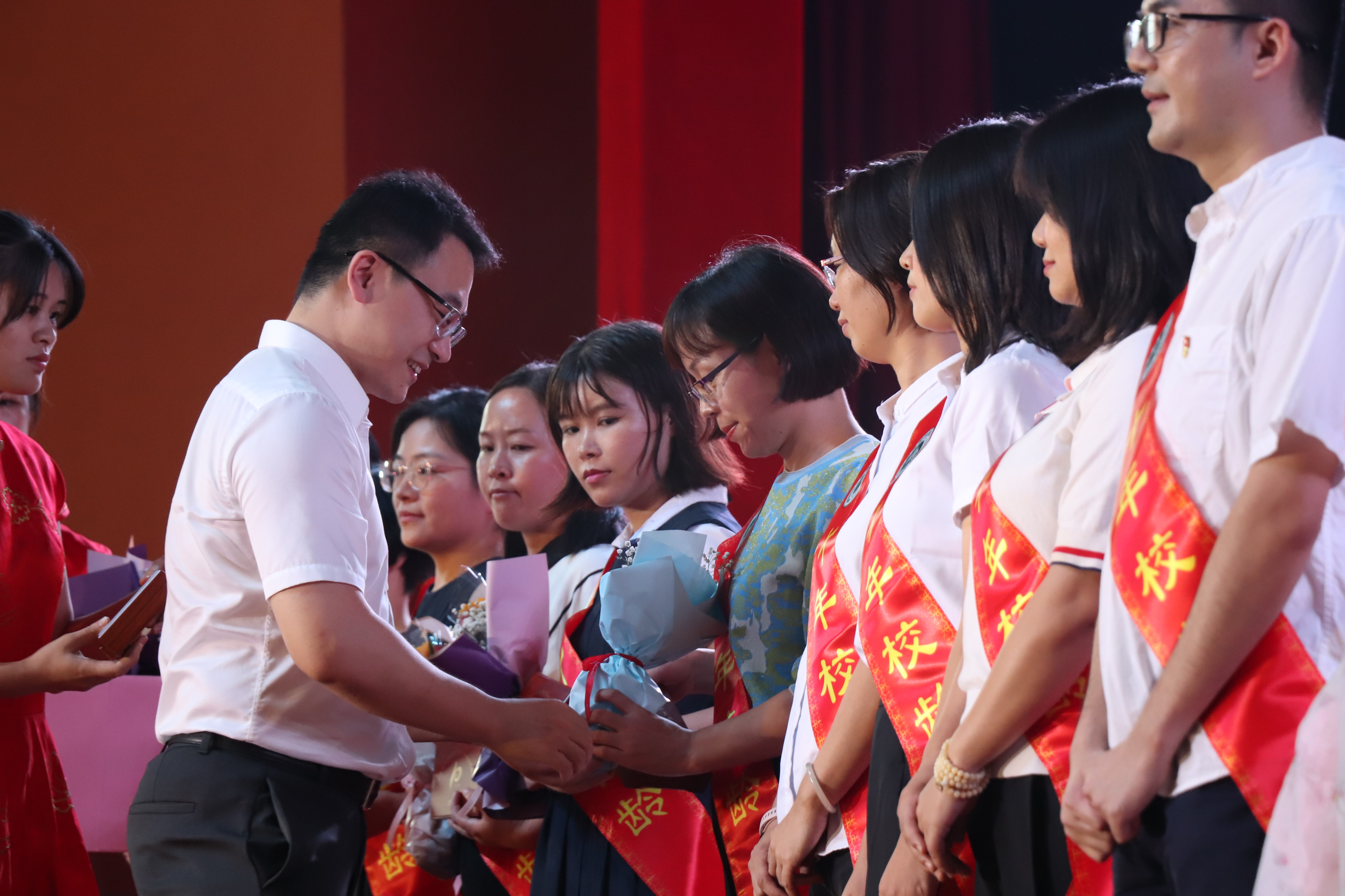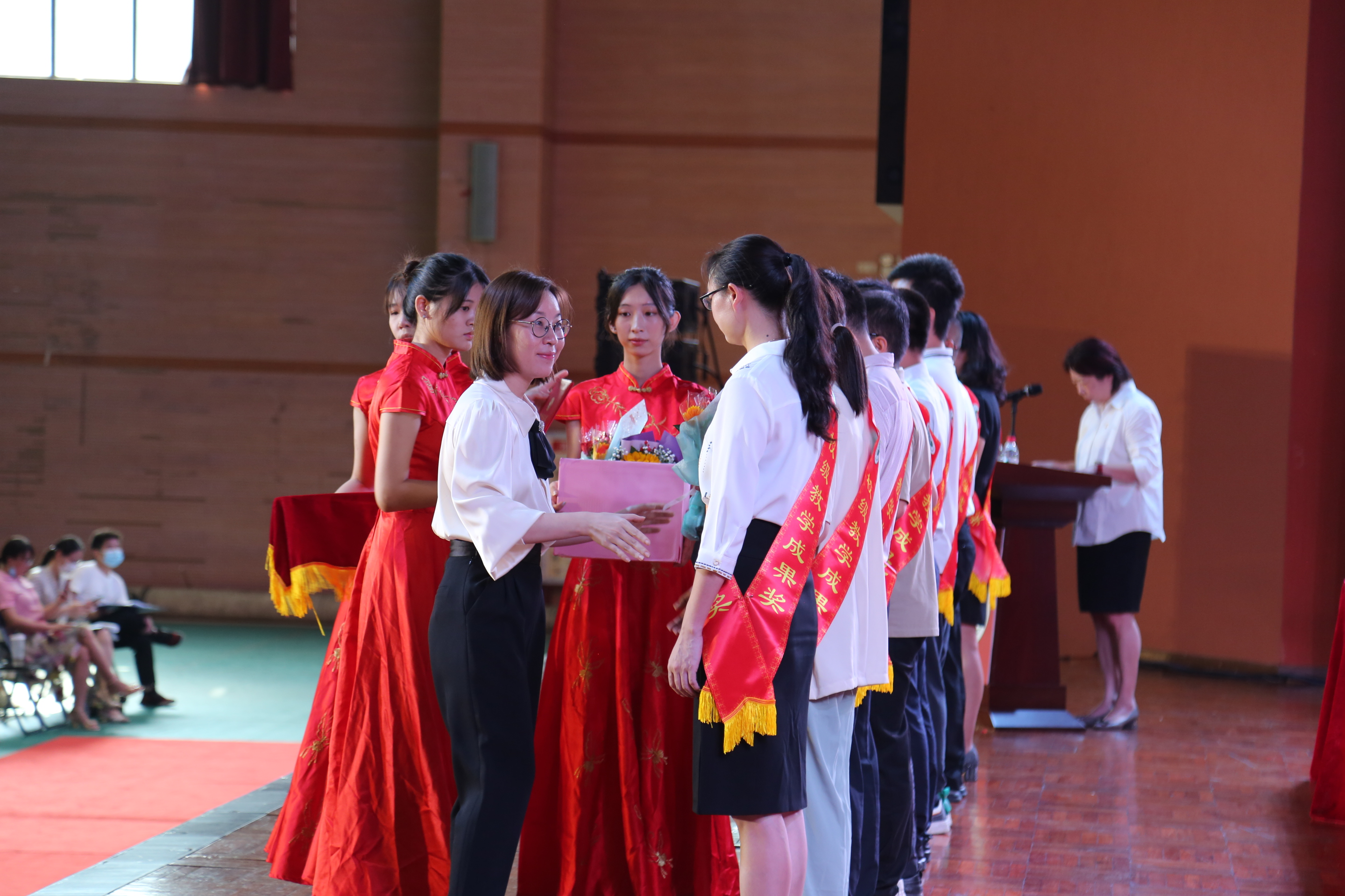 (图为副校长麦绮琳为“最美教师”获奖者颁奖)