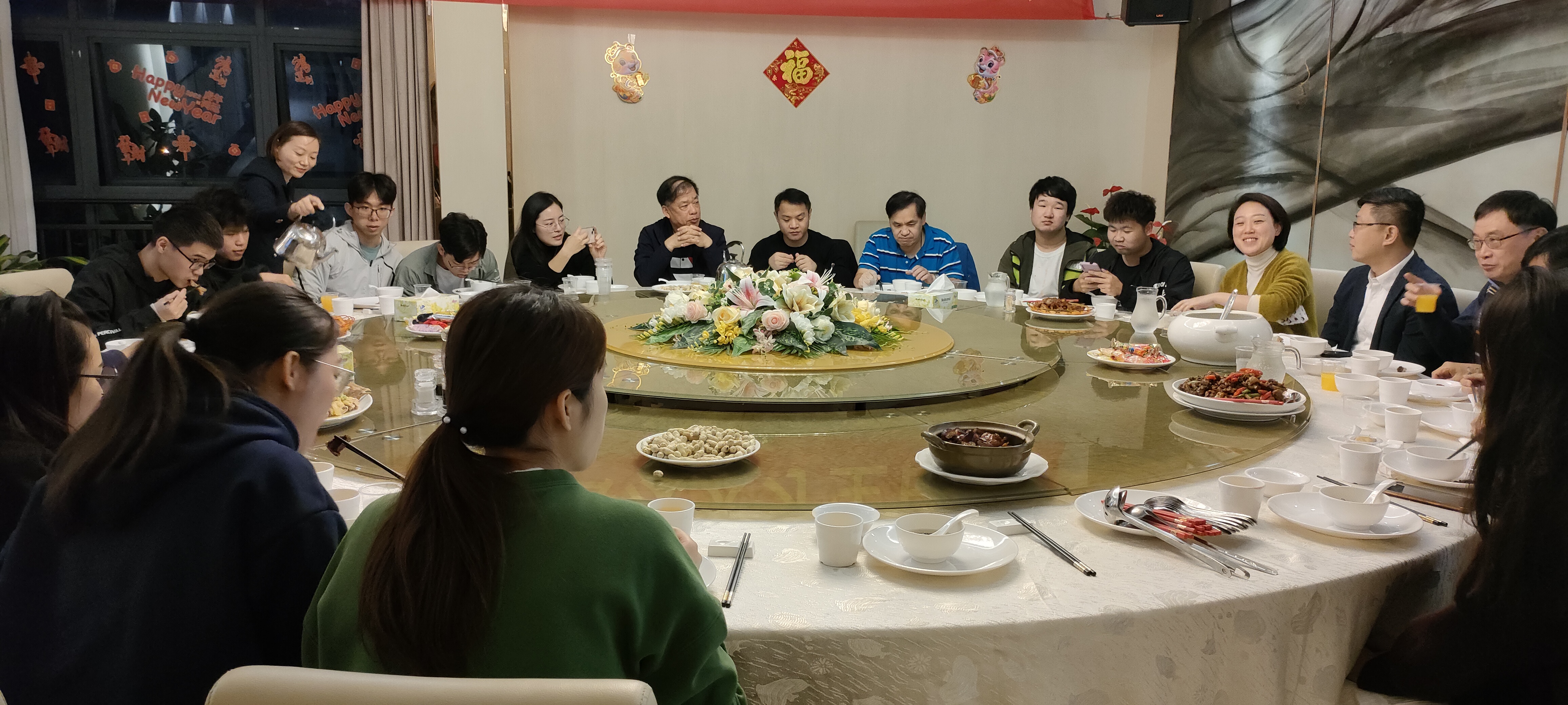 腊月二十三晚,正值小年夜之际,为了让因疫情等原因留校的师生感受到学校的关心,同时也体验中国春节习俗,学校组织了留校台湾籍老师和留校学生共聚荔香园,同享晚宴,共贺新春。学校副校长林江龙,人事处处长李海冬,国际交流中心副主任魏航,学生处副处长、团委书记李瑶,后勤保卫处处长助理段妍君等领导老师与18名留校师生参加了小年夜晚宴。
