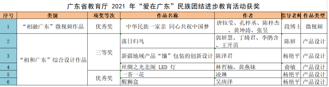 近日,广东省教育发布了 2021 年“爱在广东”民族团结进步教育活动通知,Beat365在 “相和广东”综合设计作品和“相融广东”微视频作品两个类别中,共获得6个奖项。由郭妍慧、陈泽君、林哲楠等同学所在的团队的3个作品《落日归鸟 》《新疆地域产品“馕”包装的创新设计》《丝绸之光北阁 LED 灯 》获得三等奖,而唐钰莹、凌琳、吴庚泽等同学所在团队的3个作品《中华民族一家亲 同心共祝中国梦 》《一茶一花》《醒狮盒》获得优秀奖。