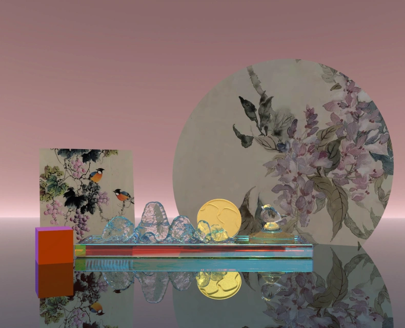 《落日归鸟》参赛队伍来自创意设计学院师生组。该作品以镬耳屋为设计元素,其设计理念是以长方形的托盘作底,笔架是通过镬耳屋的曲线渐变拉伸得来的,有高瘦、矮胖等形态,前后错位摆放,营造出镬耳屋“远近高低各不同”的景象。提取出来的曲线通过旋转成为一枚印章,印章的图案运用了此元素印章的顶部屹立一只小鸟,小鸟比印章的身体设计得要大一些,便于拿取,整体效果是一幅日落时分小鸟立在镬耳屋之上的画卷。在作品创意点在于整体上采用透明的材质,用金属作点缀,形成材质对比。托盘、笔架与印章结合,融合广府文化镬耳屋的曲线元素。