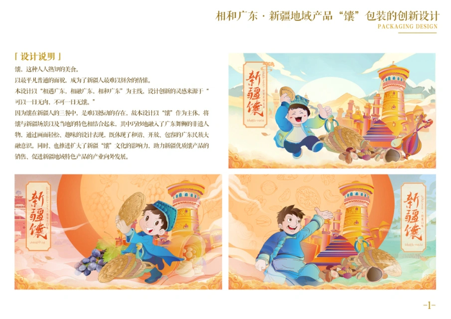 《新疆地域产品“馕”包装的创新设计》参赛队伍来自创意设计学院师生组。该作品设计以“相遇广东,相融广东,相和广东”为主线,设计创新的灵感来源于“可以一日无肉,不可一日无馕。”馕在新疆人的三餐中,是难以撼动的存在,故本设计以“馕”作为主体。将馕与新疆场景以及当地的特色相结合起来,其中巧妙地融入了广东舞狮的非遗人物,通过画面轻松、趣味的设计表现,既体现了和谐、开放、包容的广东民族大融合意识。同时,不仅扩大了新疆“馕”文化的影响力,还有助于销售新疆优质馕产品,促进新疆地域特色产品向外发展。