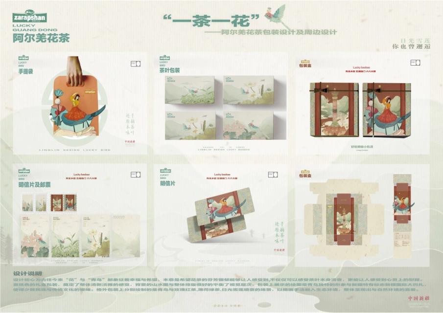 《一茶一花》参赛队伍来自创意设计学院师生组。该作品的设计初心为古往今来“花”与“青鸟”都象征着幸福与希望,本意是希望花茶的芬芳馥郁能够让人感受到不仅仅可以感受茶叶本身清香,更能让人感受到心灵上的慰藉。宣纸色的礼盒包装,奠定了整体清新淡雅的感觉,背景的山水图与整体排版很好的平衡了视觉层次。包装上展示的绘图是青鸟独特的形象与新疆特有标志新疆国际大巴扎,使得少数民族与传统文化的碰撞。格外包装上分别绘制的是青鸟与玫瑰红茶.薄荷绿茶.日光雪莲嬉耍的场景,以插画手法融入生态环境,整体呈现出与自然环境的喜爱。