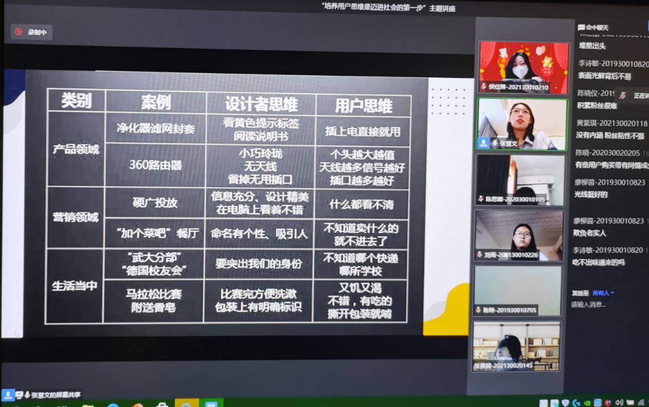 为了更好地培养学生的用户思维,文学与传媒学院于2022年4月7日下午在企业微信视频会议举行“培养用户思维是迈进社会的第一步”主题讲座。此次讲座由文传学院新媒体教研室专任教师张慧文老师主讲,文传学院各级学生代表参与了本次会议。