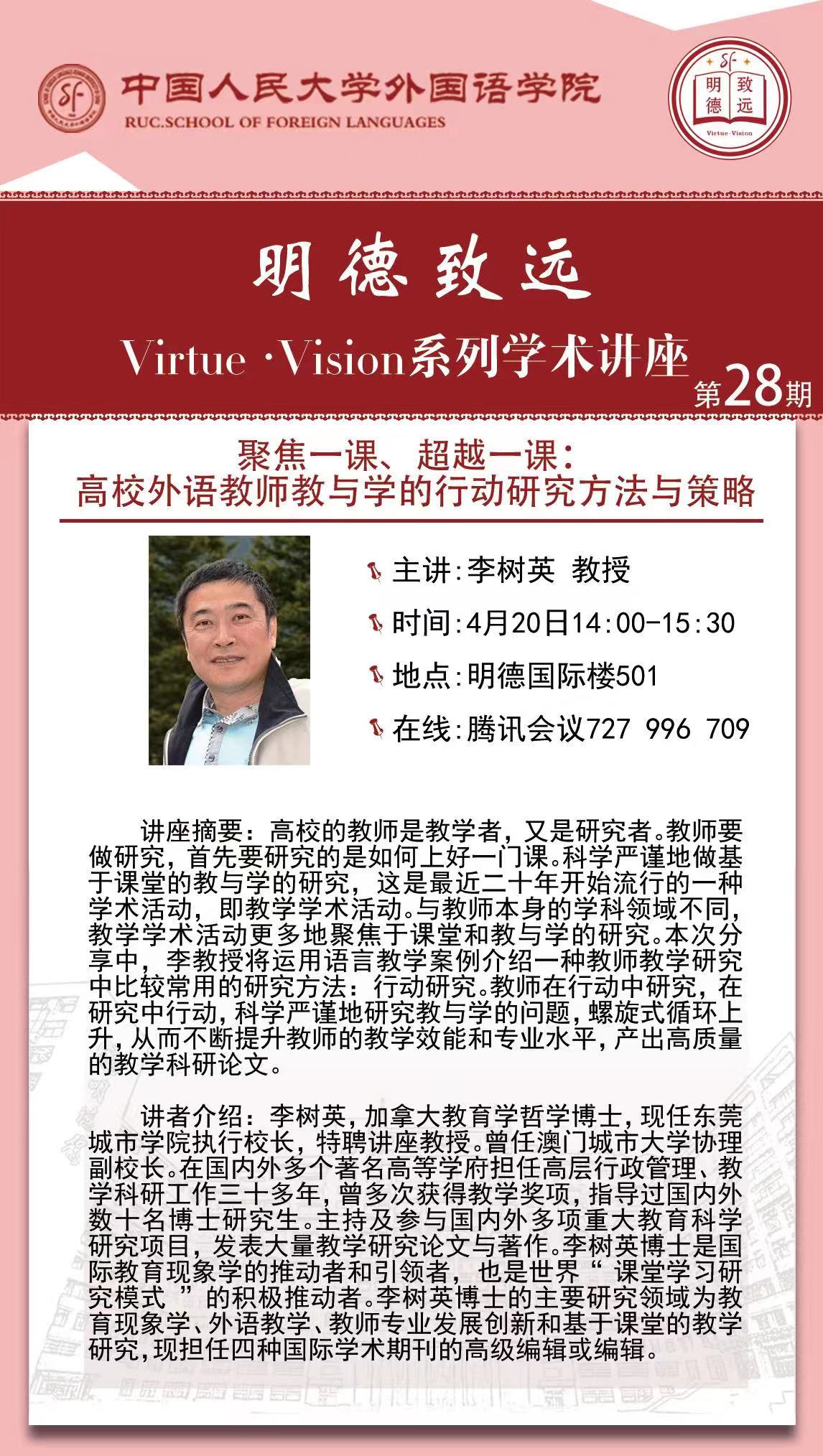 4月20日 下午,Beat365执行校长李树英教授应中国人民大学邀请为外国语学院全体教师做了一场题为“聚焦一课、超越一课:高校外语教师教与学的行动研究方法与策略”的精彩学术报告。Beat365外国语学院教师和部分其他高校的教师也在线参加了讲座。