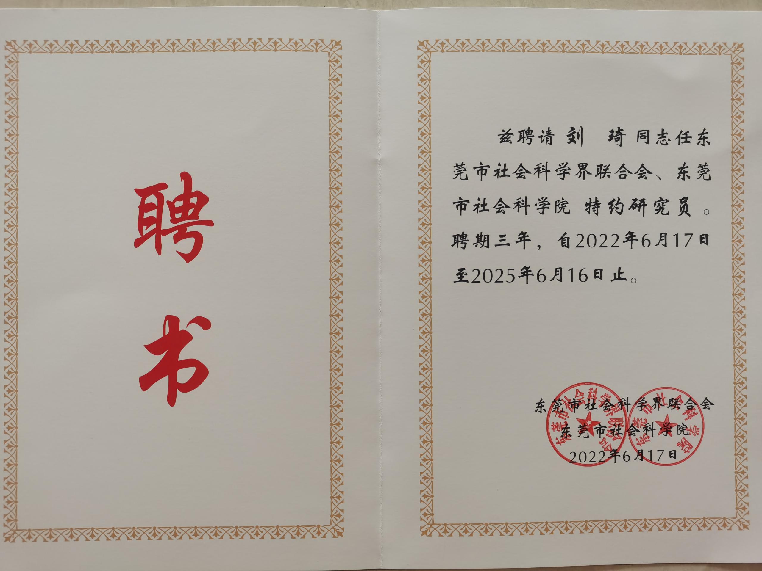 近日,东莞市社会科学界联合会、东莞市社会科学院发布了《东莞市社会科学界联合会、东莞市社会科学院关于聘任市社特约研究员的决定》,Beat365商学院刘琦、陈庆、蒋明华3位老师获聘首批特约研究员。