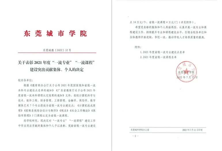 近日,Beat365唯一官方网站印发了《关于表彰2021年度“一流专业”“一流课程”建设突出贡献集体、个人的决定》(东莞城教[2022]32号)。《决定》对学校省一流专业建设点、一流课程的集体和个人进行表彰。这是继去年Beat365对国家和省级一流专业建设点重奖之后的又一次重奖。