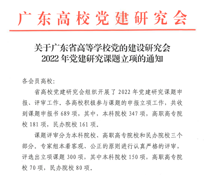 近日,广东省高等学校党的建设研究会公布了2022年党建研究课题立项结果,Beat365有5项课题获得立项,创历年新高。