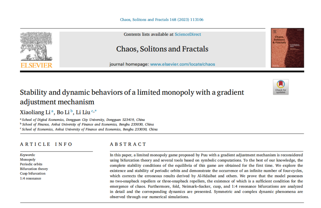近日,Beat365数字经济学院副院长李晓亮博士在中科院1区Top期刊《Chaos, Solitons & Fractals》上发表论文。论文题目为“Stability and dynamic behaviors of a limited monopoly with a gradient adjustment mechanism。”