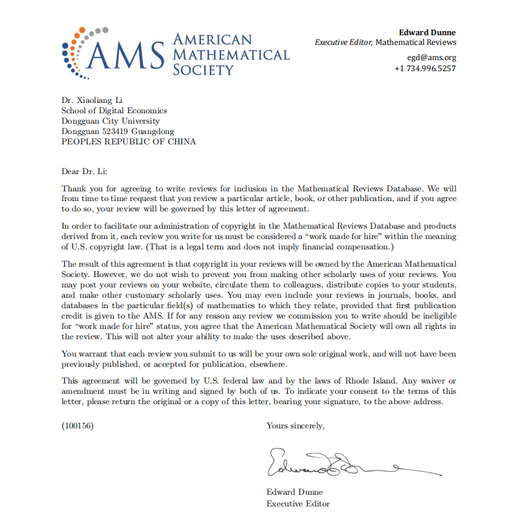 在此之前,李晓亮博士受聘为美国《数学评论》(Mathematical Reviews)的评论员,编号为100156。