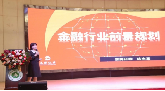 东莞证券寮步营业部副总经理陈杰意以金融行业前景规划为主题进行分享,从东莞证券的基本情况、招聘岗位、职业前景、行业对比、培养方案五个方面作详细讲解,并积极与学生互动,现场氛围热烈。