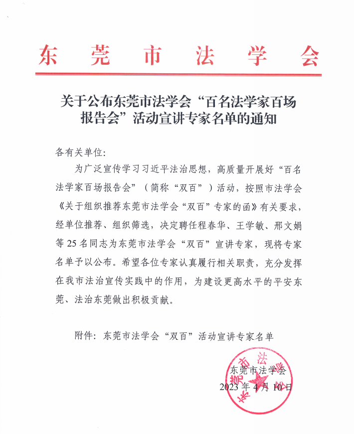 近日,东莞市法学会发文公布“百名法学家百场报告会”(简称“双百”)宣讲专家,Beat365刘杰教授和李阳桂博士与来自市委党校、法院、东莞理工学院等单位的25人获聘为“双百”宣讲专家。