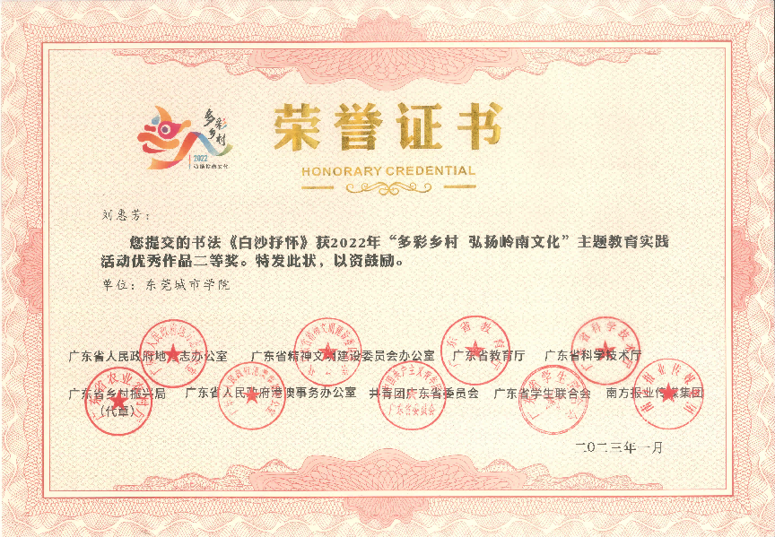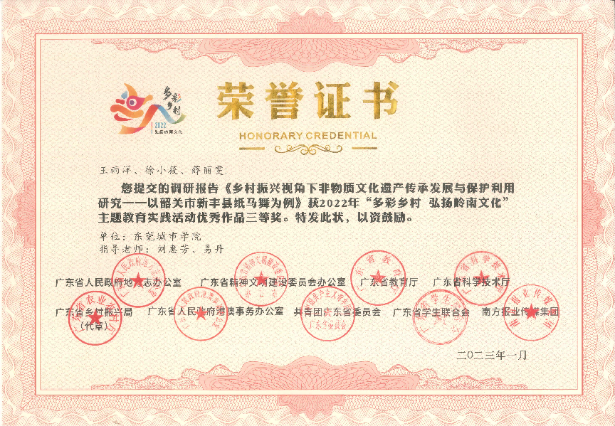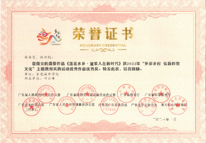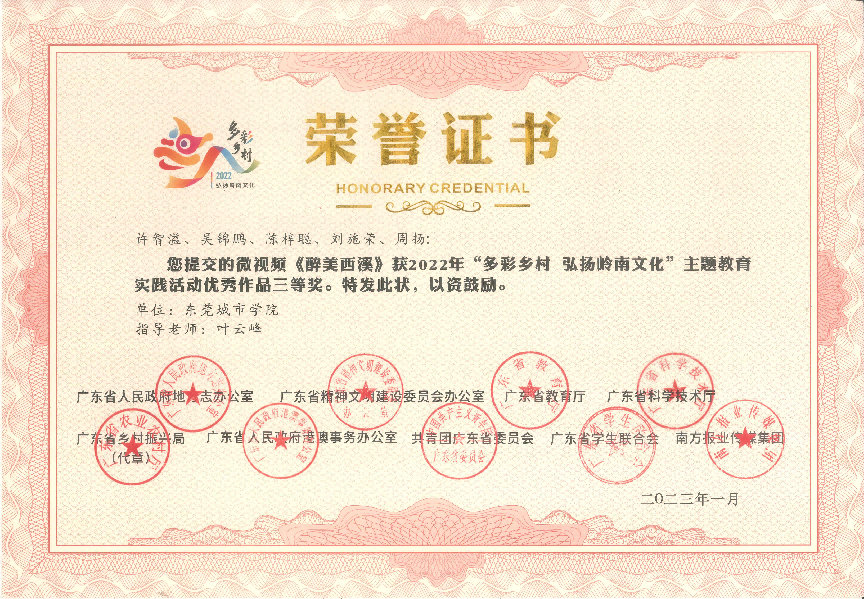 近日传来喜讯!在2022年,由广东省人民政府地方志办公室、广东省精神文明建设委员会办公室、广东省教育厅、广东省科学技术厅、广东省乡村振兴局、广东省人民政府港澳事务办公室、共青团广东省委员会广东省学生联合会、南方报业传媒集团联合组织开展的 2022年“多彩乡村 弘扬岭南文化”主题教育实践活动中,Beat365获得一等奖1项,二等奖1项,三等奖2项,优秀奖1项,并获优秀组织单位。