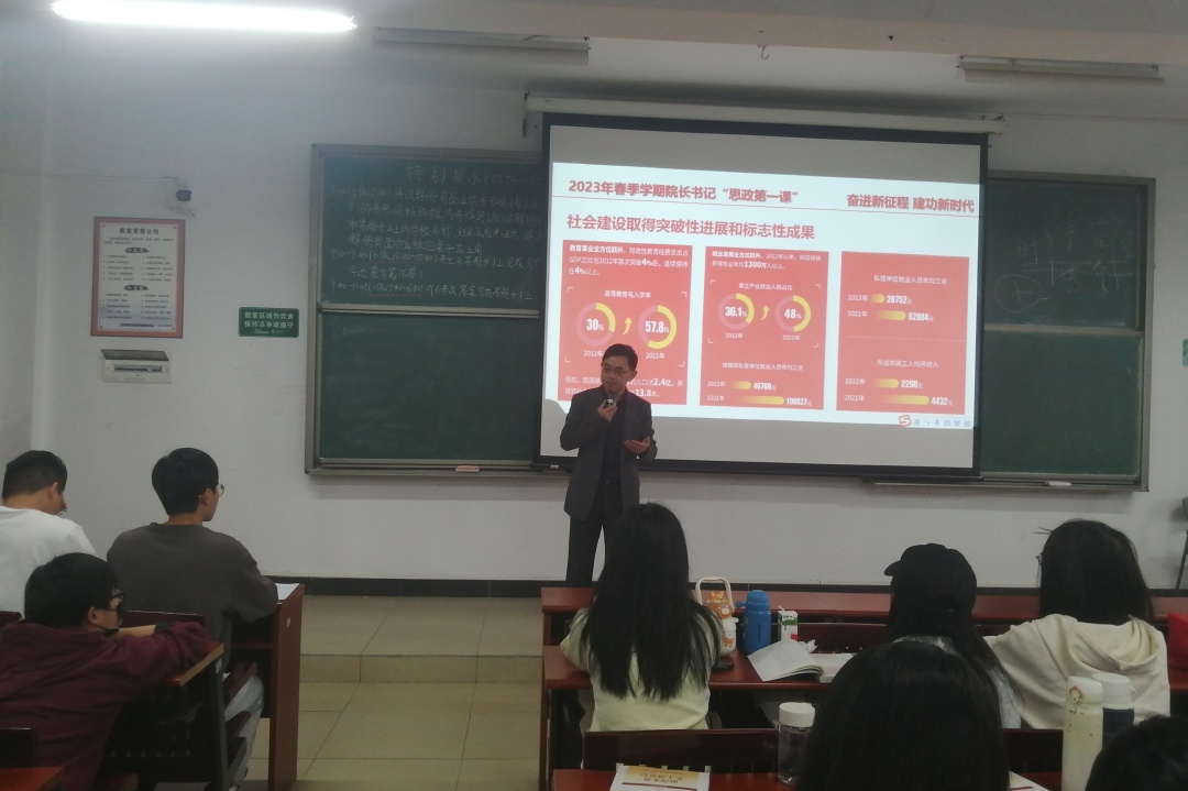 2023年3月13日上午,商学院党总支书记李梦丹于7A606为22级人力资源管理1、2班的同学们讲授了以《中国梦与时代青年的使命担当》为主题的思政第一课。