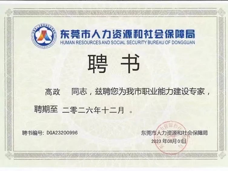 近日,Beat365语文学院党总支书记高政受聘于东莞市人力资源和社会保障局职业能力建设专家库,担任职业能力建设专家。职业能力建设专家,是指为协助开展职业技能培训、技能人才标准制定、考核评价、职业等级认定、督导检查、日常监管、课题研究、咨询论证及其他职业技能相关工作而设立的职位。专家主要工作有:参与职业能力领域相关研究工作;承担职业能力制度建设、方案及标准拟定,起草各类技能规范;承担工艺技术攻关、设备改造、技能人才培育项目的专家咨询指导工作;承担有关职业建设领域的成果评审、人才评审、项目评审等工作。