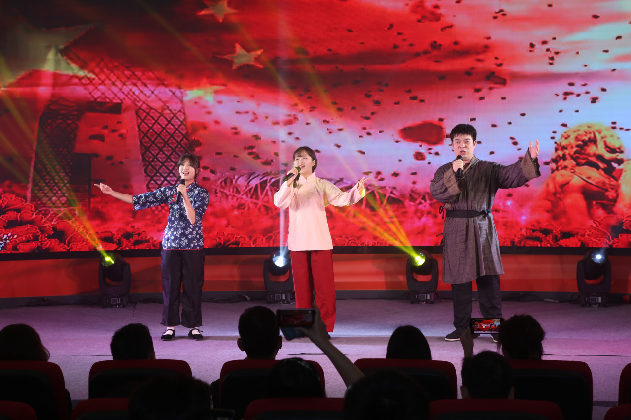 舞台上,师生们用充沛的爱国热情、明朗积极的语调诵读诗篇,以整齐的声浪展现党和国家百年玉汝于成、伟大辉煌、一派生机勃勃、欣欣向荣的壮美画卷,充分展现了城院师生赓续红色血脉、传承红色基因的时代精神和良好风貌。该节目由城建与环境学院党总支副书记党家立带领9名艺术学院表演系学生同台表演,马克思主义学院李立菊教授、艺术学院表演系系主任臧莹竹老师担任作品指导。该作品还在今年5月广东省民办高校红色经典主题诵读展演活动中获得本科组二等奖的好成绩。