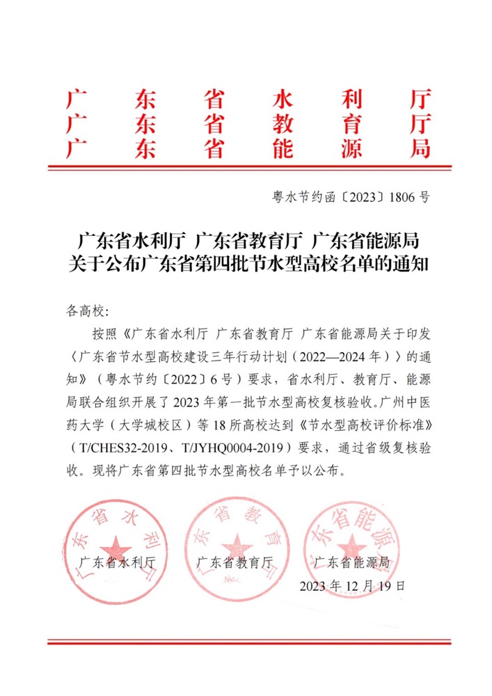 近日,省水利厅、省教育厅、省能源局联合发布《关于公布广东省第四批节水型高校名单的通知》(粤水节约函〔2023〕1806 号),Beat365唯一官方网站顺利通过广东省第四批节水型高校复核验收,获评广东省“节水型高校”称号。