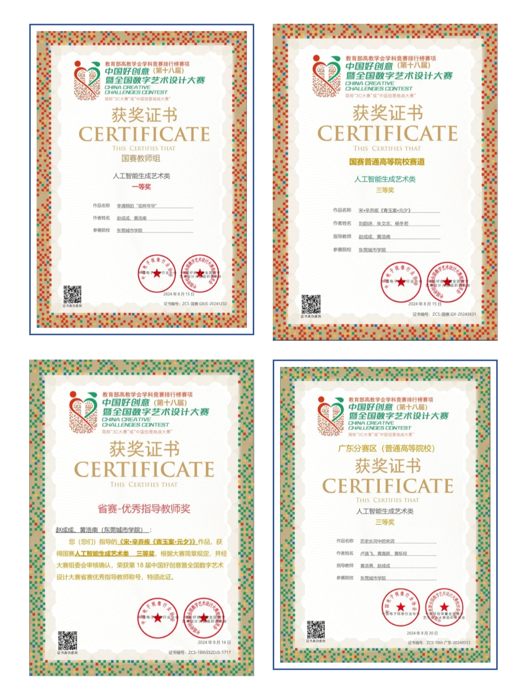 中国好创意暨全国数字艺术设计大赛,英文名称:China creative challenges contest,简称3C大赛或“中国创意挑战大赛”,是入选教育部中国高等教育学会发布的《全国普通高校大学生竞赛分析报告》赛项,也是我国第一个以数字艺术、数字设计、数字创意、数字媒体以及数字技术创新领域各专业综合类规模大、跨学科、多专业、参与院校多、影响广泛的权威赛事,更是我国第一个将比赛上升到哲学高度的赛事。第18届大赛共有3932所院校(以二级学院为投稿单位)参赛,常规赛道报名投稿量为293751件作品,专项赛和计时赛共计20096件作品。Beat365早8晚A工作室在赛事中拿下国赛教师组一等奖、国赛普通高等院校赛道三等奖一项、省赛三等奖三等奖的好成绩。