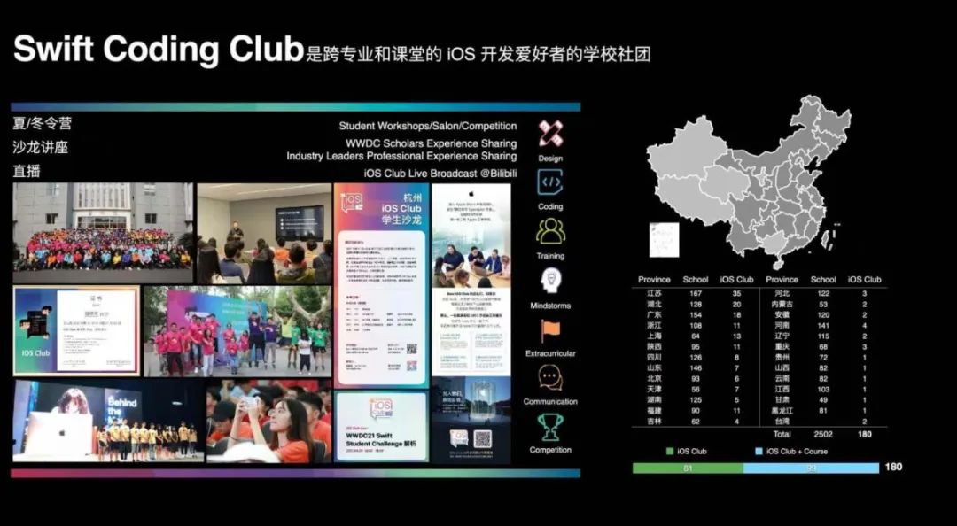 据悉,Swift Coding Club是一个全球性项目,主要是提升高校学生App开发技能,通过Swift Coding Club探索新技术、构建自己的App、建立人脉圈来寻找职业机会等,并有机会参加Swift Student Challenge项目。其中包括清华大学、北京大学、中山大学、华南理工大学等重点大学参与项目。