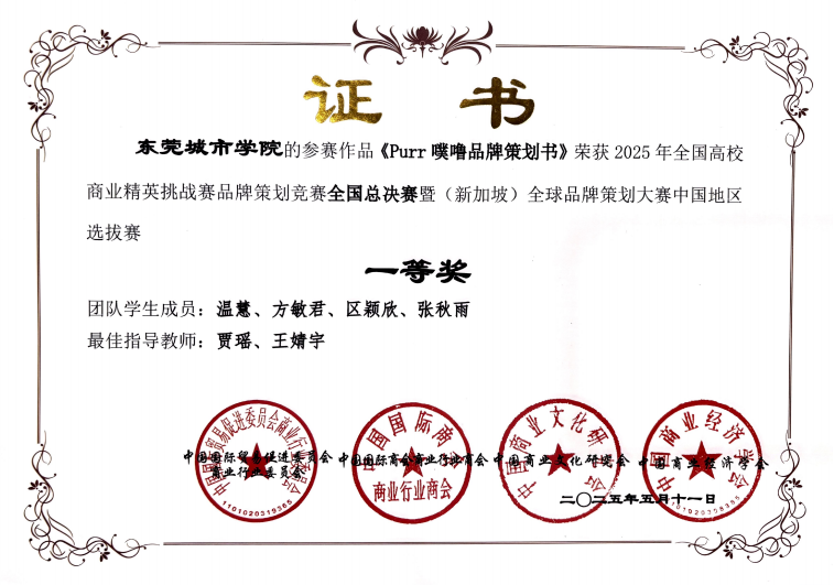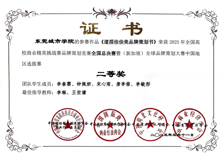 本次大赛汇聚全国700余所高校、超10000支队伍参赛。其中不乏985、211学校、双一流学校,所有队伍不分赛道、同台竞技。在如此激烈的竞争中,由王婷老师、熊瑛老师指导的“湛佳红橙品牌策划案”团队,贾瑶老师、王婧宇老师指导的“Purr噗噜品牌策划书”团队脱颖而出,摘得全国一等奖;李琳老师、王世谦老师指导的“道滘佳佳美品牌策划书”团队荣获全国二等奖。