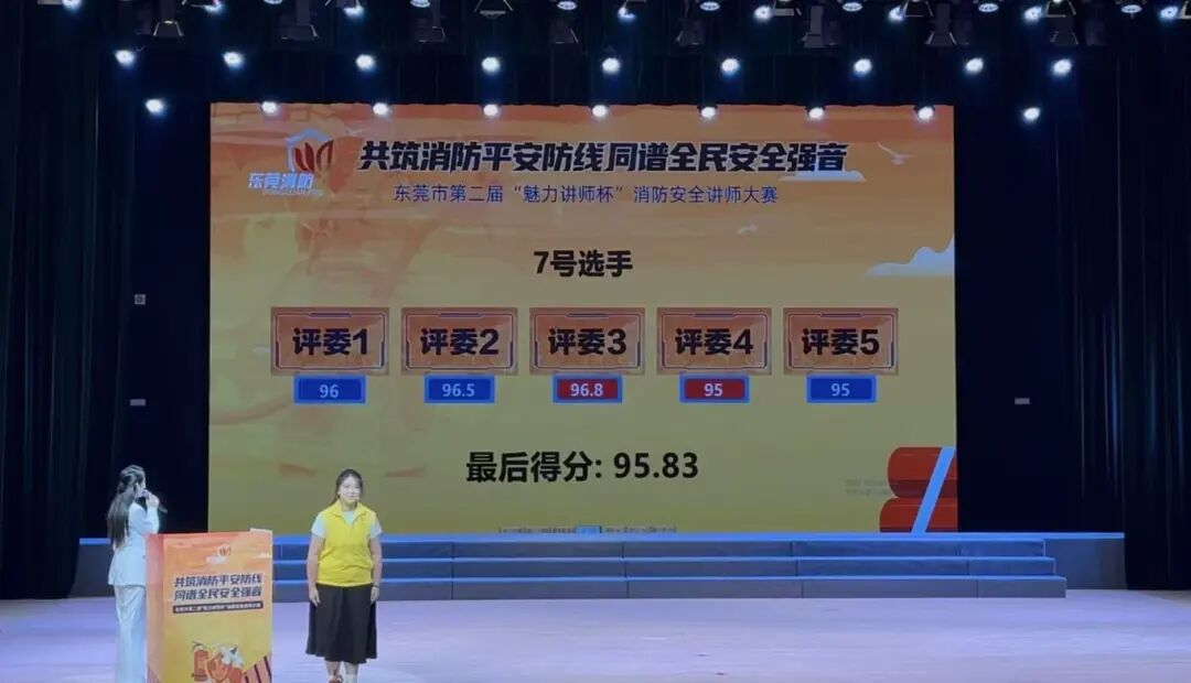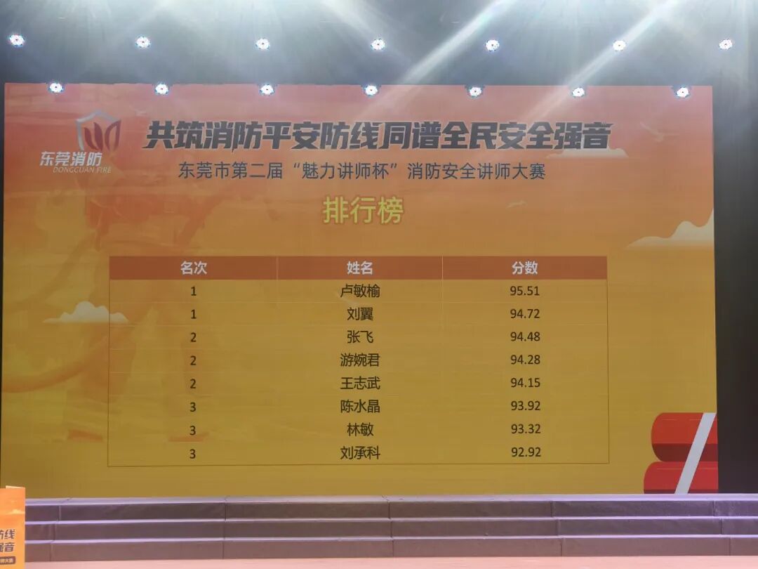 本次大赛汇聚了东莞市各领域消防安全宣讲精英,竞争激烈。卢敏榆同学凭借生动的案例讲解、专业的消防知识储备以及富有感染力的宣讲风格,在众多选手中脱颖而出,以95.51分的优异成绩摘得桂冠;张飞老师则以扎实的消防专业知识、清晰的逻辑架构和深入浅出的授课技巧,获得94.48分,荣获第三名。