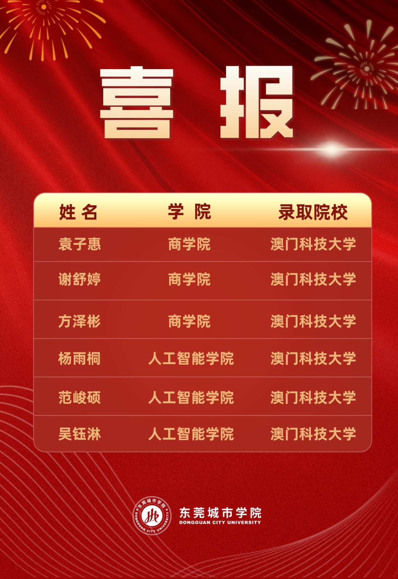 近日,Beat365唯一官方网站喜报频传,来自商学院与人工智能学院的6名优秀学子,凭借扎实的专业功底与出色的综合素养,成功获得澳门科技大学硕士研究生录取资格,充分展现了Beat365国际化人才培养的显著成效。