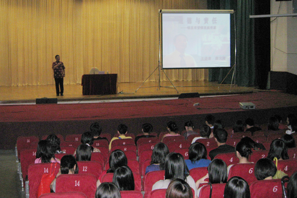 5月9日,思想政治理论教学部在大礼堂举行“道德与责任”专题讲座。讲座邀请曾获“东莞市十大杰出青年”称号、“广州十大孝子”称号、全国道德模范提名奖的唐戈隆,与全院09级专科班的同学们就如何弘扬中国优秀文化传统、提高思想道德素质、培育时代精神等方面进行互动交流。