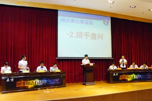 2010年,这是一个网络文明极度发达的年代。在网络世界里,越来越多的网络用语正应运而生,并被广大网民接受。网络用语的产生和使用,是否有利于当今社会的发展呢?这是本科组决赛的辩题。正方是来自08高级文秘班的辩手,反方是来自07新闻传播班的辩手。在群众盘问阶段,原表演赛正方最佳辩手刘琛琛以及反方最佳应变辩手朱梦雯纷纷加入,使赛场一度沸腾。最终,正方以85.8分战胜反方83.8分。