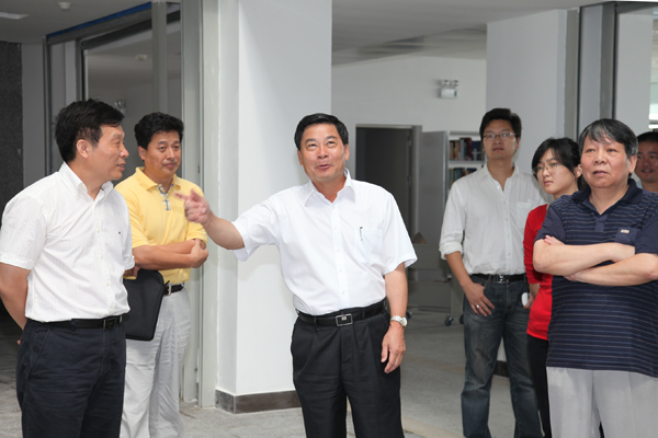 6月4日,东莞理工学院党委书记周致纳在城市学院院长安少华、党委书记朱志德、副院长程发良、党委副书记朱冰的陪同下视察新落成的图书科技信息大楼。