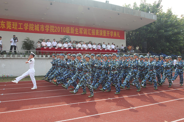 东莞军分区副司令员李建军,东莞理工学院领导周致纳、安少华,东莞理工学院城市学院第二届董事会董事长、广东鸿发集团总裁麦照容,城市学院院、系领导出席典礼并在主席台观看了军训表演,给军训先进个人和连队颁奖。