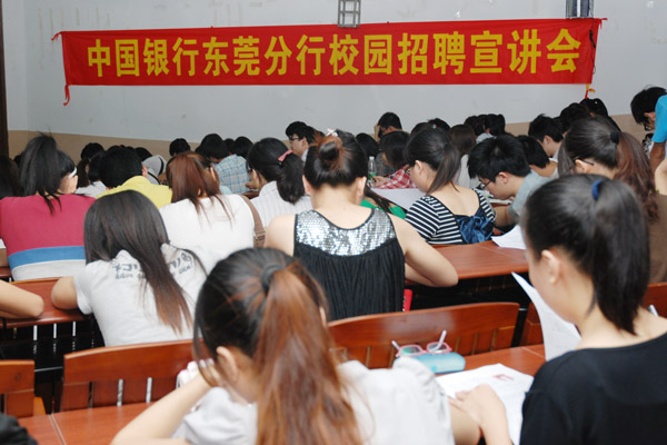 10月14日,我院举行2011届毕业生首次单场招聘会,中国银行东莞分行进校招聘大学毕业生,300名准毕业生到会应聘,应聘者中以财经系会计学专业的学生居多。