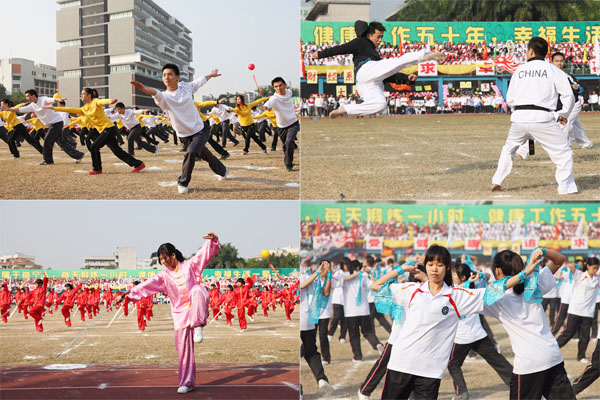 据悉,参加开幕式表演的师生超过千人。由500名教职员工组成的广播操表演方阵率先登场。他们整齐划一、刚柔并济的表演,博得了现场师生的热烈掌声。随后进行的跆拳道表演,将开幕式掀向了高潮,他们强而有力的动作,整齐铿锵的喊声,赢得了在场师生的热烈掌声和喝彩。而在此方阵中,学校特聘了数名参加过亚运会开幕式跆拳道表演的选手,进一步提高了表演的观赏性。400名女生表演的集体舞,青春活力,尽显健与美。