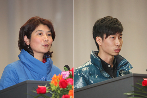 先进班集体代表08国贸2班班主任卢晓晴,获得国家奖学金代表政法系汤文杰同学在会上发表了获奖感言。