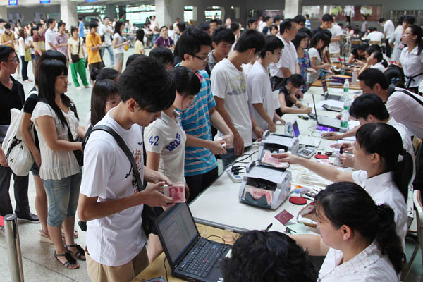 (图为财务办工作人员利用新系统为学生办理缴费手续)