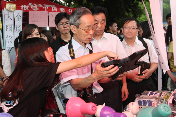 乔将军对我院“肯干、好用、实在”的人才培养思路表示赞同,对同学们通过工模锻炼能力的方法表示肯定,他还特地在工模摊位上买了一个小鼠标作为纪念。他说:“今后用到这个鼠标时,我就会想起城院,想起在城市学院第六届工商模拟市场中的美好回忆。”乔将军还对陪同逛市场的朱志德书记说,若自己再年轻50岁,也一定来这里摆个摊位。年逾古稀、精神矍铄的乔将军用他自己的言行,践行了他在大讲堂上告诉我们的“保持童真”的真谛,给我们大学生又上了一堂人生教育课。