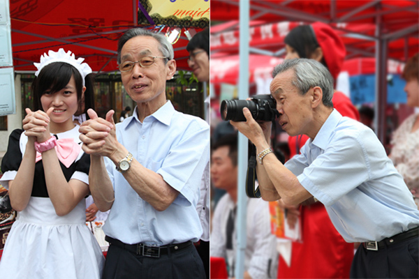 乔将军就像个孩子一样,对工模充满了好奇感。一路上左顾右盼,还不断拿起手中的相机拍照,抓拍精彩瞬间。当逛到女仆咖啡屋时,乔将军被一群cosplay的女仆吸引,还与女仆们合影留念。看到卖花卉的摊位,则走上前左看看,右瞧瞧,还不忘用手摸一摸,向“花店老板”询问花的名字和养花的技巧。当来到一间精品摊位前时,他又被一块迷你版的“黑板”所吸引,这时的乔将军兴起,当即在小黑板上画下了自画像,还帮摊主也画了一张,引起了周围同学的围观。在乔将军作好画之后,同学们纷纷鼓掌称好。