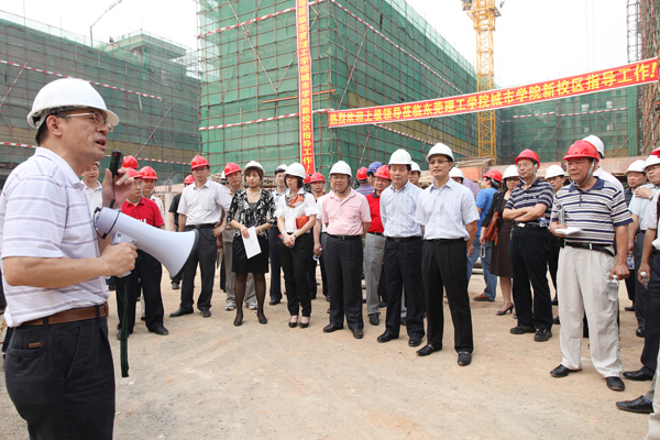与会人员参观时看到,由于各方面的支持配合,经过三个月的紧张施工建设,学生宿舍楼、教学楼、学生食堂、学生活动中心已经封顶,有的开始室内外装修;图书馆、综合馆、教师宿舍主体工程已基本完工;其他场馆也全面开工。整个工程建设正在按照“9月1日交付使用、确保新生入驻”的工作目标强力推进。大家讨论认为,新校区选址正确,位置很好,规划科学,布局合理,设计理念先进,施工进度快。