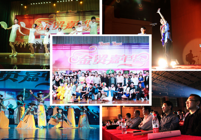 缘分让国贸2班走在这个美丽的城院,一首优美的《红日》歌曲拉开了嘉年华的帷幕;国金3班的《CRAZY》像是在演绎着一只雄鹰展翅飞翔的过程;穿着红色衣服的民族舞和蓝色衣服的健美操,柔中带刚、刚柔结合、红蓝分明。模特秀《夜魅惑》用旗袍、婚纱在台上用π的形式绽开,展现着中西合璧的服装特色,更显金贸嘉年华的海纳百川的情怀。坐在舞台上谈《心愿》让观众感觉更加贴切;舞台剧《超幸福·鞋垫》引起了观众们一阵阵呼喊:“超幸福!超幸福!超......!”