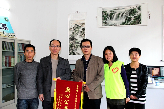 12月9日,东莞市肢残协会郑穗生副主席携同莞科社工刘苑容来到我院,给机电系和文传系志愿者赠送“热心公益”的锦旗,以感谢志愿者在东莞市虎英公园由东莞市残联和莞科社工举办的“我梦想我登高”残疾人登高游绿道活动的付出。