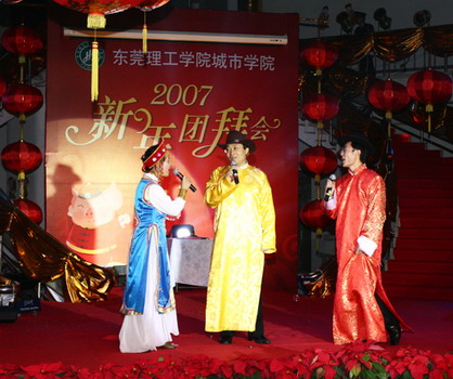 1月22日的大学生活动中心,张灯结彩,笑语欢歌,暖意融融。主席台上“恭贺新春”的印章衬底和各色花卉交相映衬,洋溢着浓浓的春意。城市学院2007年新年团拜会在这里隆重举行。中共东莞市委副书记刘树基同志,东莞市副市长周致纳同志,东莞理工学院历届领导,城市学院党政领导与500多名教职工及其家属欢聚一堂,辞旧迎新,互致问候,共贺新春佳节。