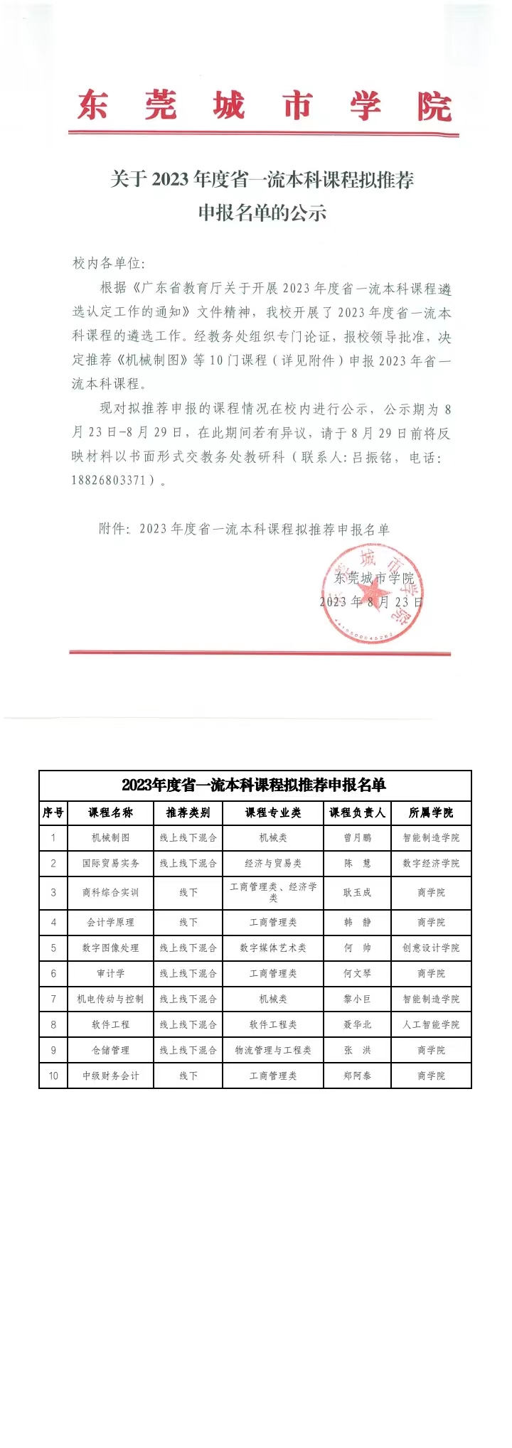关于2023年度省一流本科课程拟推荐申报名单的公示